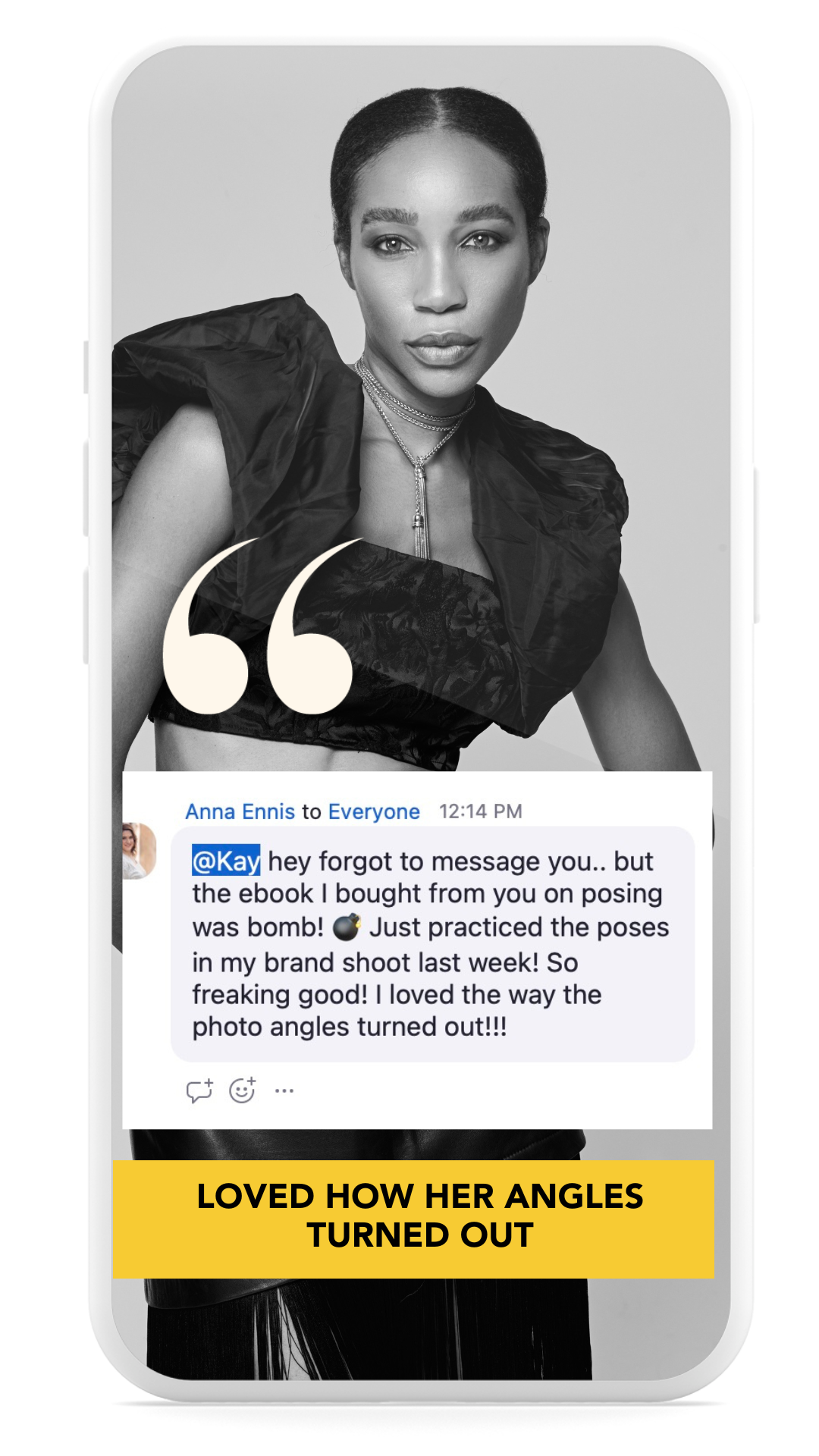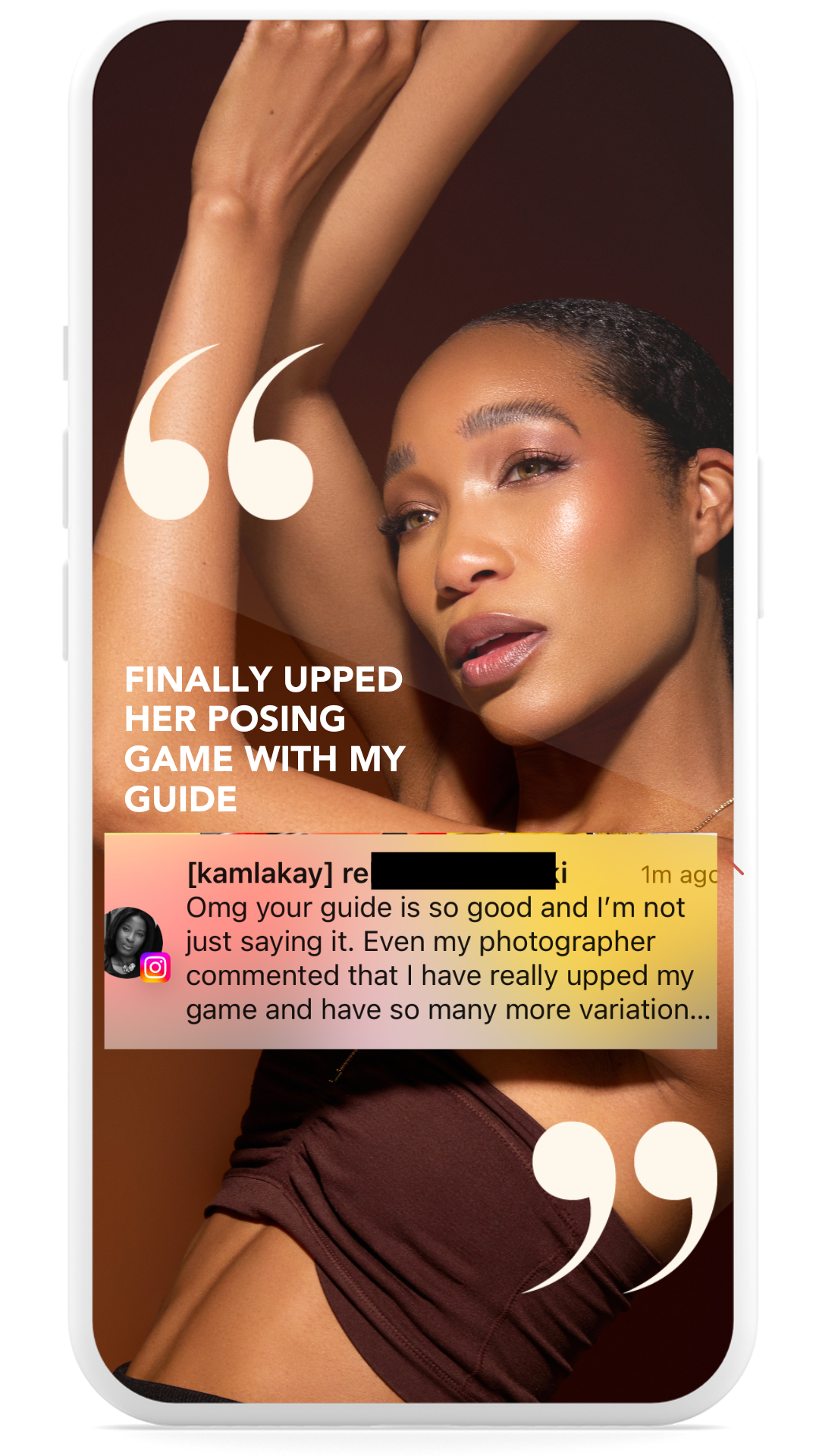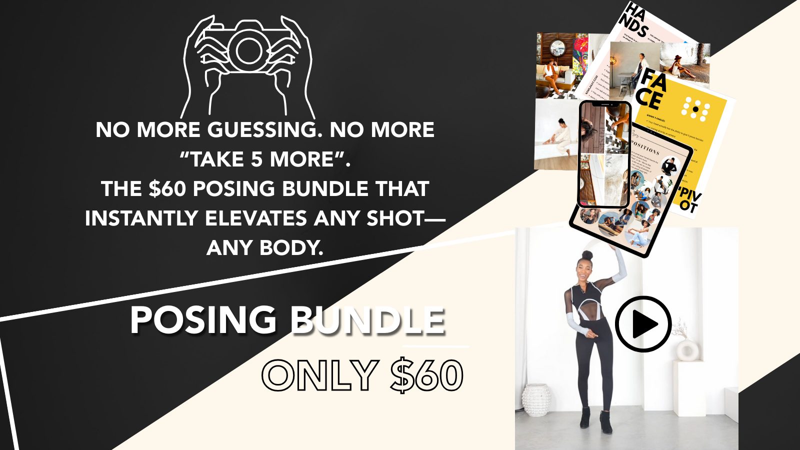 At checkout, Pair Supermodel Secrets with "Stunning Poses" PDF—100+ curated pose inspirations & exclusive cheat code tips tailored to the photos you see—so you have the perfect reference on your phone during any shoot.